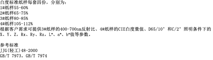 简介: 白度标准纸样是按照JJG(轻工)48-2000中的要求制备的,用于符合GB/T 7973-2003、GB/T 7974-2002规定的白度计的检定和校准、工作白板的量值标定、紫外辐射量的调整等。