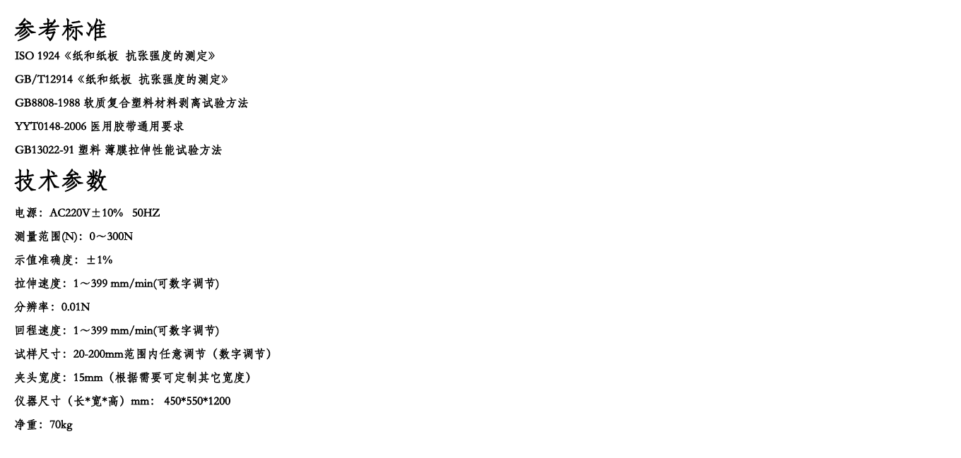 简介: 立式电脑拉力仪是测试纸张、纸板、塑料薄膜以及其他非金属材料抗张强度、 裂断长、伸长率、抗张能量吸收、抗张指数、抗张能量吸收指数、180度剥离强度、热封强度的专用仪器。仪器采用立式、单柱结构,夹头间的距离可在一定的范围内进行调整。试验时实时显示拉伸时间、负荷张力。试样断裂时即显示抗张力、抗张强度值、抗张指数、裂断长、伸长率、抗张能量吸收指数、抗张能量吸收值和裂断时拉伸时间,并可显示抗张曲线。在拉伸一组试样后,又能方便地用按键,直接显示和打印出各测定参数的平均值、标准偏差和变异系数。