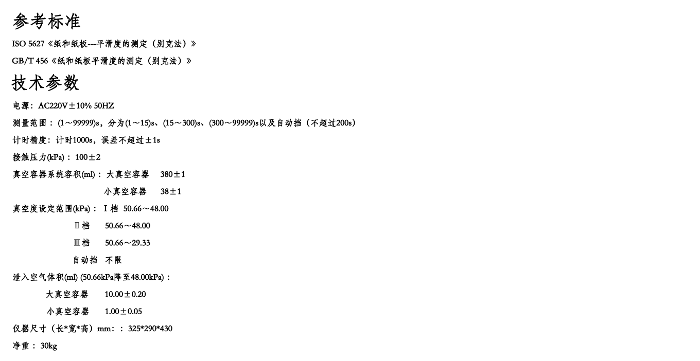 简介: 全自动平滑度测定仪是测定纸张平滑度的专用仪器。根据国际通用的别克(Bekk)式平滑仪工作原理设计。 仪器在机械设计上取消了传统的杠杆加重锤的手动施加压力结构,创新式地采用凸轮加弹簧,利用同步电机自动旋转加载标准压力。大大减少仪器的体积与重量。仪器采用7.0英寸大屏幕彩色触摸液晶屏显示,具有中、英文菜单。界面美观亲和,操作简便,测试时一键操作。仪器新增了“自动挡”测试,在测试高平滑时能大大节约时间。仪器同时具备测试、计算两面差的功能。仪器采用高精度传感器和原装进口无油真空泵等一系类先进的元器件。仪器具有标准中包含的各项参数测试、转换、调节、显示、记忆、打印功能,仪器具有强大数据处理能力,可直接得出各项数据的统计结果。仪器具有技术先进、功能齐全、性能可靠、操作方便等优点。