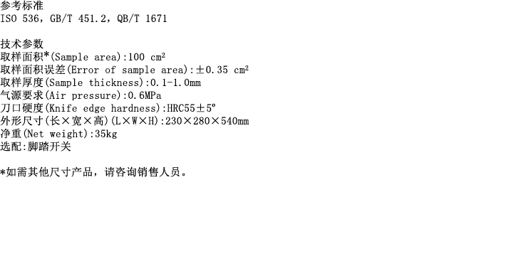 简介: 气动圆形定量取样器可快速并准确地冲切100cm2的样品,同时不会造成纸张和纸巾的变形和损坏。本机可轻松冲切多个样品,并配有安全防护罩。