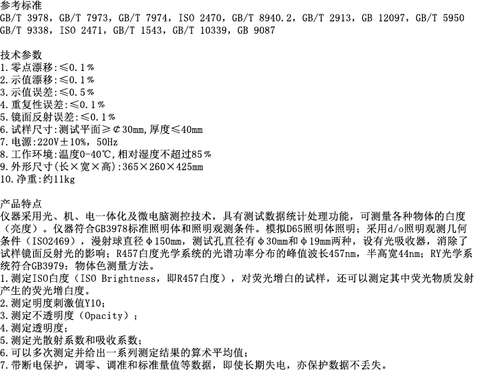 简介: 本仪器用于测定物体的白度,广泛应用于造纸、纺织、粉体、印染、塑料、陶瓷、搪瓷、粮食、建材、油漆、化工、盐和其他需要测定物体白度的生产和商检部门。仪器可以测定ISO白度(ISO Brightness,即R457白度),对荧光增白的试样,可以测定其中荧光物质发射产生的荧光增白度,可测定纸张及其他薄页材料的透明度、不透明度、光散射系数和吸收系数等。