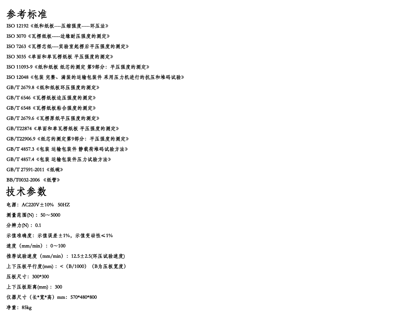 简介: 多功能压缩试验机(纸管平压强度测定仪)是测定纸张环压强度(RCT)、瓦楞纸板边压强度(ECT)、瓦楞纸板平压强度(FCT)、瓦楞纸板粘合强度(PAT)、瓦楞原纸平压强度(CMT)、纸管平压强度、小纸盒抗压的专用仪器。是目前国内性价比非常高的一款高精度压缩强度测试仪器。