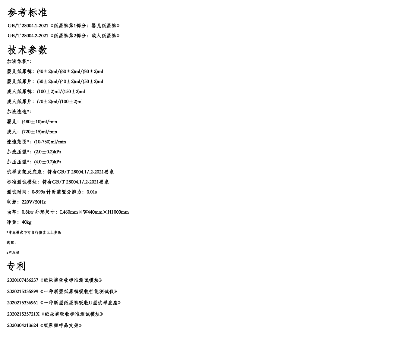 简介: 纸尿裤吸收性能测试仪(T 025C)是测定纸尿裤、纸尿片产品吸收速度、回渗量、渗漏量等参数的专用单工位仪器。纸尿裤吸收性能测试仪由U型试样底座、样品支架、标准测试模块、移动加压装置、自动加液装置、自动计时装置等组成。