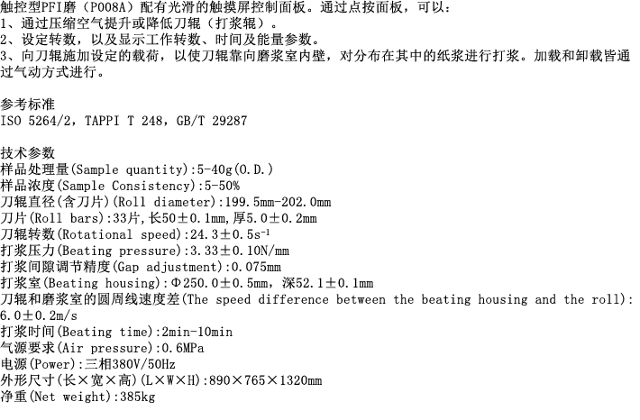 简介: PFI磨浆机是用于打浆和分离未完全分解的纤维材料的装置。是形成手抄纸页之前对纸浆进行加工处理的高精度实验设备,可以确定在一定的打浆参数下纸浆的状态。因为该设备具有极佳的可重复性,非常适合实验室中对少量纸浆的研究和常规检验。