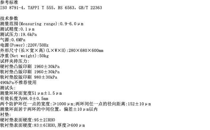 适合高档文化用纸、涂布纸、新闻纸、涂布板纸、挂面箱板纸、薄膜薄片、印刷纸等的表面粗糙度的测量。仪器配有采用特殊工艺加工的高精度测试头,配有环型保护环,具有高复现性、测量准确等特点。