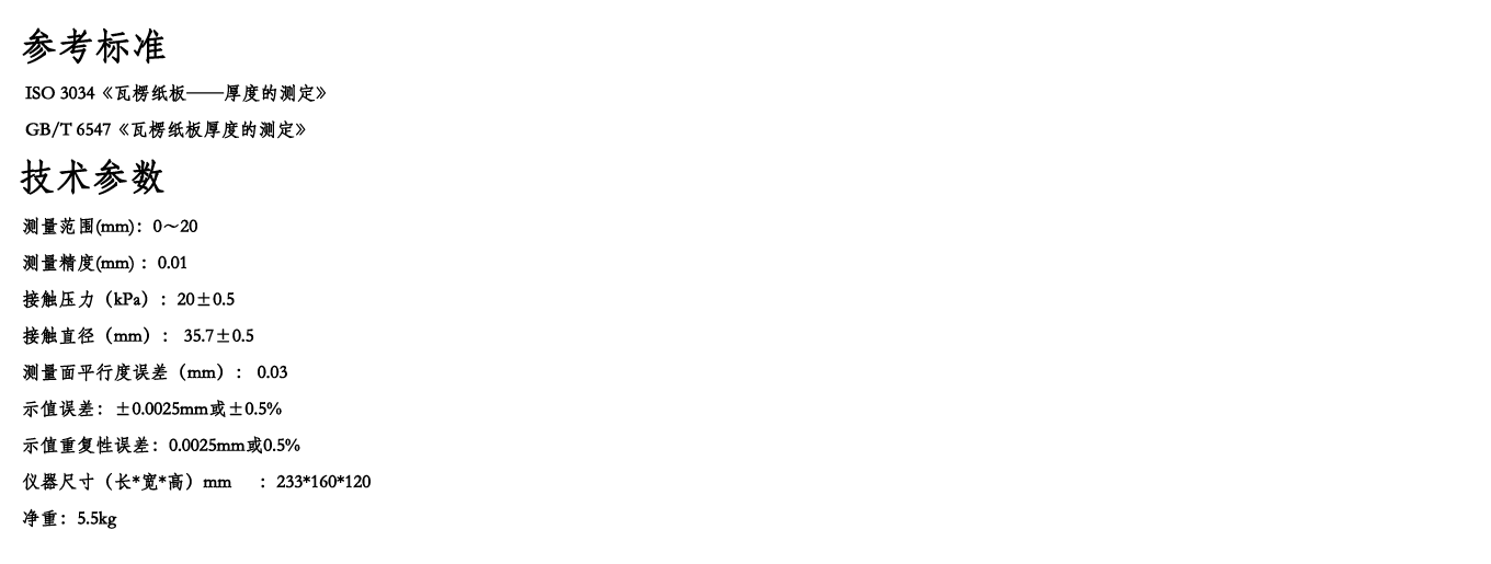 简介: 瓦楞纸板厚度仪是用来测量瓦楞纸板厚度的专用仪器。适用于瓦楞纸板及其他片状材料的厚度测定。该仪器是纸板、纸箱生产、科研及商检等企业和部门不可缺少的常用仪器。