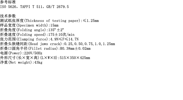 简介: 该设备具有自动夹头复位功能,用于厚度小于1.25mm的各种纸张、金属薄片和薄膜的耐折度测定。MIT耐折度是指纸张在一定张力下能够经受135º折叠的次数。