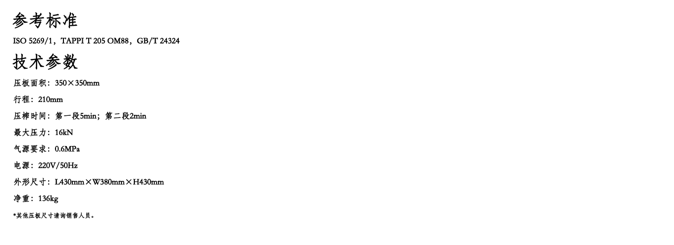 简介: 本气动式压榨机适用于方形或圆形片材的脱水和压榨。配有两个可调节定时器,可对纸页完成标准规定的两段压榨。
