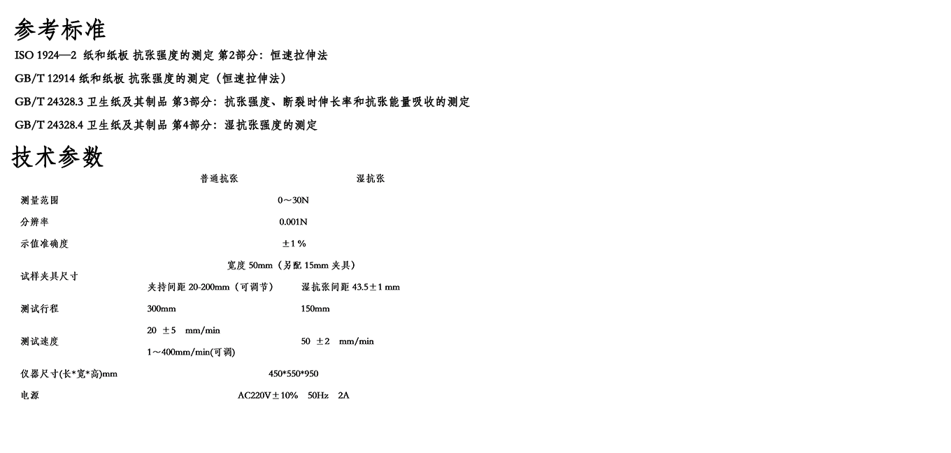 简介: 拉伸试验机是纸和纸板抗张强度性能检测的基本仪器,主要适用于纸和纸板抗张强度、伸长率和抗张能量吸收值的测定,也可用于其它低抗张强度、低伸长率片状材料的抗张性能试验。配合芬奇杯可测定卫生纸及其制品湿抗张强度。