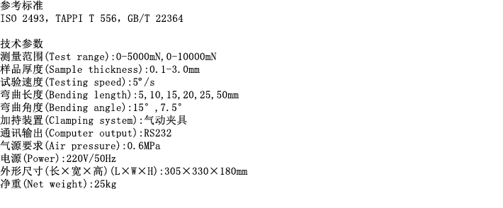 简介: 该设备使用高精度微力传感器,配合刀型测头,保证测试的准确。大尺寸触摸屏可直接显示试样弯曲到指定角度所需的最大力值、图表、统计函数和比率等,易于操作。可借助称重平台方便、快速地进行校准(此操作需要专业计量人员完成)。