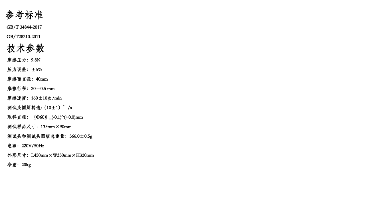 简介: 耐摩擦试验仪由主机,旋转机构,直线往复运动机构,配重单元组成,适用于壁纸湿摩擦色牢度的测定。仪器往复运动采用伺服电机驱动,噪声小,控制精确,测试速度可调,旋转运行平稳,可根据实际使用情况增加不同的负荷。耐摩擦试验仪采用彩色大屏触摸液晶显示,实时显示各项数据,参数设定简单,测试方便可靠,自动化程度高:可进行数据处理和动作控制,能自动复位、过载保护。