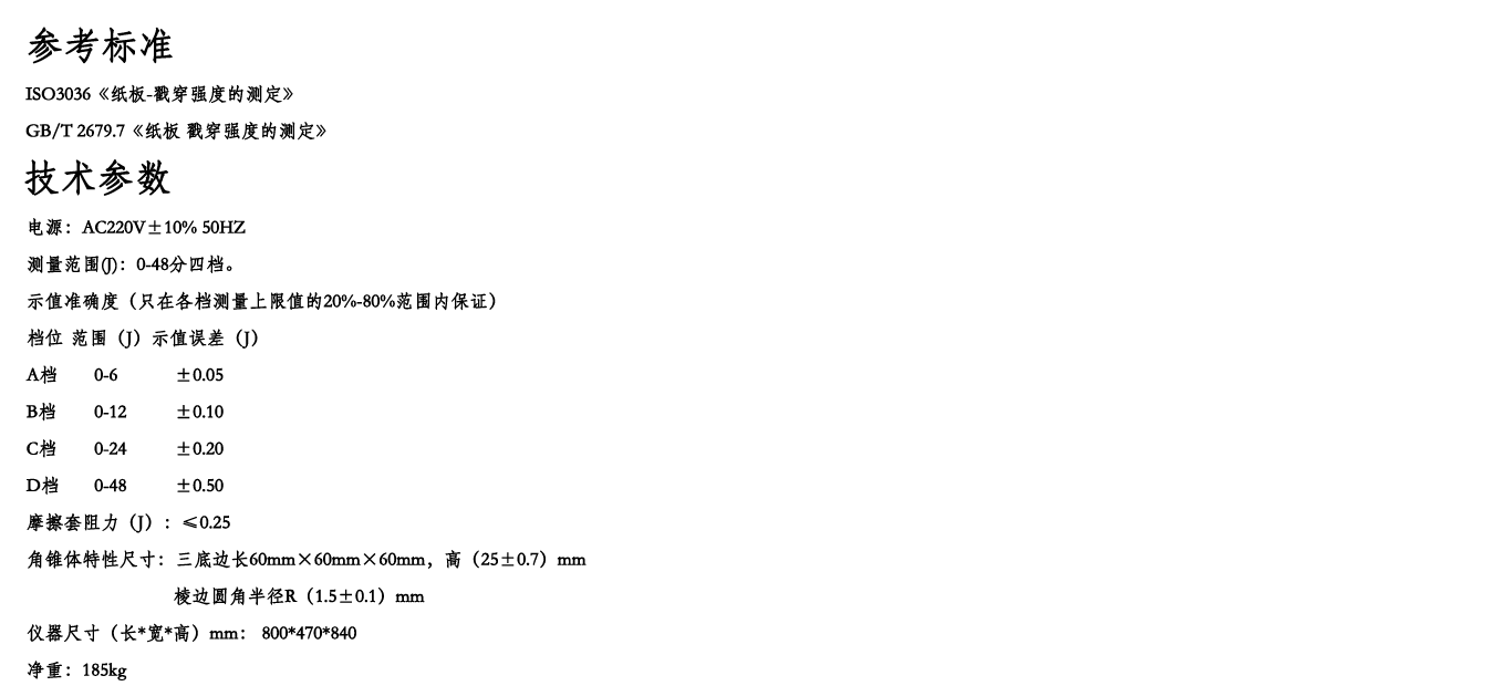 简介: 电脑测控纸板戳穿强度仪是瓦楞纸板抗戳穿性能(即戳穿强度)测定的专用仪器。仪器具有快速压紧、操作手柄自动复位及安全防护可靠等特点,其测试精度高,性能可靠,并带有计算功能,可以打印测试数据及其平均值,是纸箱生产厂、科研及质量监督检验等企业和部门不可缺少的常用仪器。