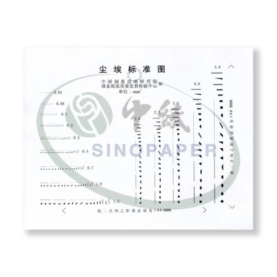 标准尘埃图为一张透明胶片,左半区为同一横行排列着面积相同但形状不同的尘埃;右半区为同一纵列排列着面积相同但形状不同的尘埃。通过对比纸张尘埃,记录尘埃的面积及个数,来检测纸和纸板的尘埃度。
