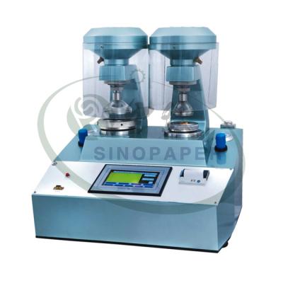 该设备按照Mullen原理,采用气动夹盘夹持试样,夹持力可调,能有效避免试验过程中的试样滑动。该设备由电机推动活塞,对液压系统加压,使样品下部的胶膜凸起,直至使样品爆裂,并记录爆裂时的峰值。此峰值即为耐破裂强度。